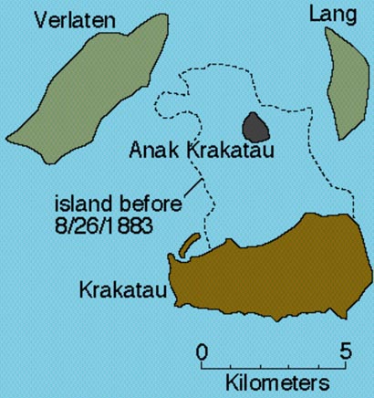 Map showing the remnant of Rakata Island (now called Krakatau Island) after the 1983 explosion and collapse and the new volcano of Anak Krakatau that subsequently emerged in 1927 from Krakatau's sunken caldera (Modified after Simkin and Fiske, 1983)