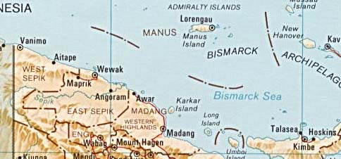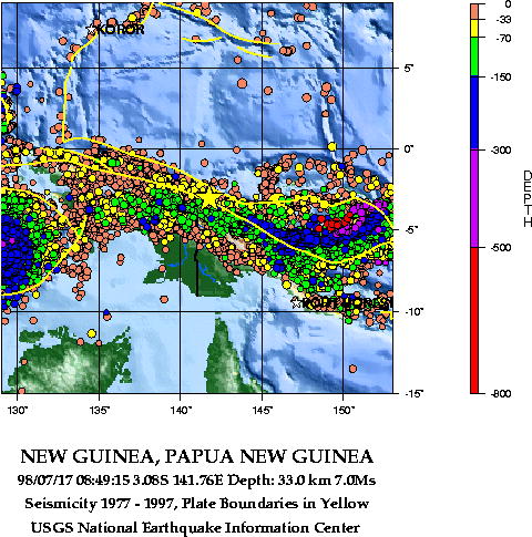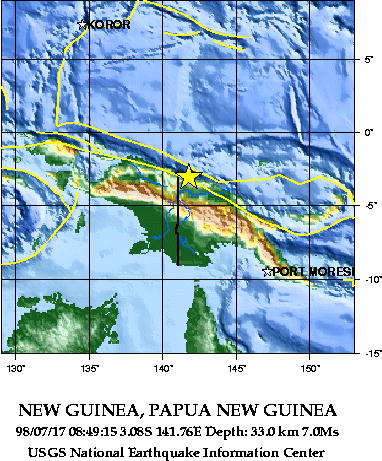 According to the National Earthquake Information Service (NEIS) of the U. S. Geological Survey, the epicenter was 3.08 S, 141.76 E (about 12 miles offshore). The depth of focus was less than 33 km and the magnitude was 7.1. A major aftershock followed, less than an hour later.