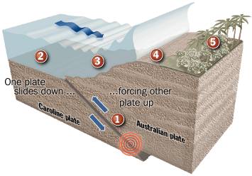 Tectonic Source Motions: The mechanism of tsunami generation was primarily the result of subthrusting of the Caroline tectonic plate underneath the Australian plate. As described above, most of the historical earthquakes in the area display a variety of faulting mechanisms but mainly are of the strike-slip or normal faulting variety. However, in the vicinity of the July 17, 1998 event, earthquake movements occur along steep dipping reverse faults.