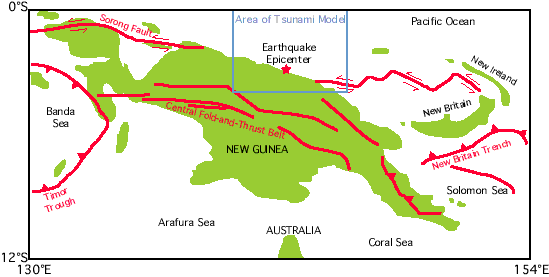 The northen coast off Papua New Guinea,along the Bismarck Sea where this earthquake occurred, is is a very active seismic region involving complex interactions and movements of tectonic plates. This is an area where the smaller Caroline tectonic plate subtrusts the larger Australian tectonic plate. Most of the earthquakes along this zone result from strike slip movements but some occur along steep dipping reverse faults with vertical components sizable enough to generate destructive local tsunamis.