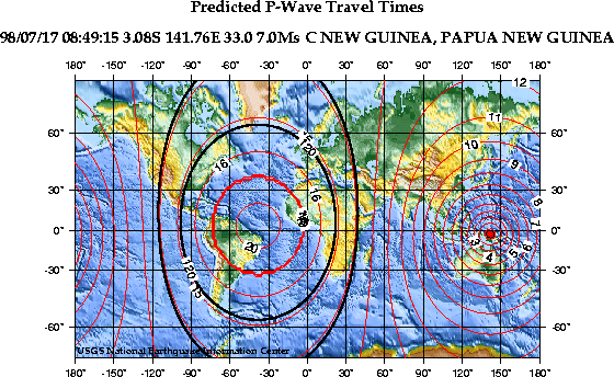 Travel Times of Compressional Seismic Waves for the 17 July 1998 PNG Earthquake (U.S. Geological Survey Map)