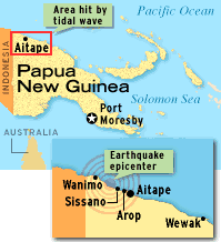 The earthquake of 17 July, 1998, generated a local destructive tsunami. Large tsunami waves destroyed primarily three fishing villages along a 30 km stretch of beach west of Atape, in the West Sepik Province of Papua New Guienea (PNG). Most of the deaths occurred at the villages on the shores of the Sissano lagoon area (see Photo below).